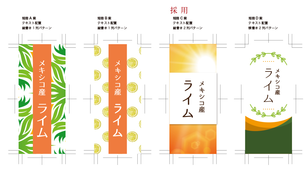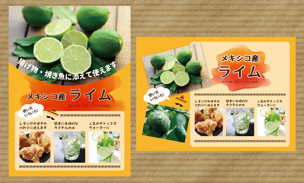 量販店の店頭で販売する際設置するライムのPOP制作及び商品ラベル制作を依頼された。商品の緑に映える色で主婦目線の温かみのあるデザインを希望された。
