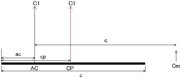 cpの位置は空力中心acにおける揚力と回転モーメントから計算できます。図で太線はコードcの翼、前縁からacの位置に空力中心ACがあり、そこに揚力Clと回転モーメントc*Cmが発生しています(註1)。この2つの働きを一つの力で表現するために必要になるのが風圧中心cpです。揚力ClによりACの周りに回転モーメントc*Cmが発生する場所(表現できる場所)が風圧中心CPの位置になります。位置cpを仮定すると図から