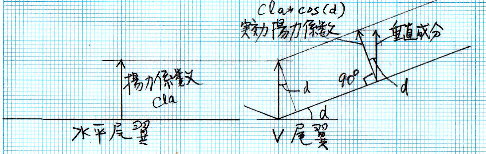 V字尾翼の水平尾翼としての働きは動圧*Cla*cos(d)^2*翼面積