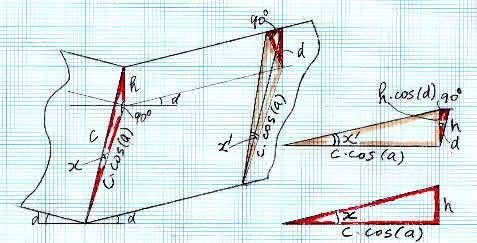 図で翼央の迎角がa(赤色三角形)の場合、角度dの上反角が付いた翼端部の迎角を求めます。揚力は翼面に垂直な方向に発生しますから、迎角もその垂直面で測る必要があります。その垂直面は上反角dだけ翼央の垂直面より内側に傾いた面になり、迎角計算の直角三角形は柿色で示しました。