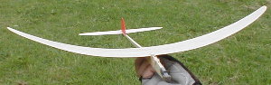 その無段上反角の主翼を二つ紹介します。カタパルトグライダーは東京都杉並区在住の小川孝夫さんのもの。水に浸しの後加重をかけてバルサをまげているそうです。