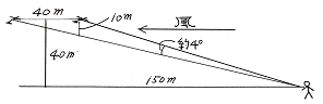 下図で機体は風下150メートル、高度40メートルの位置を中心に直径40メートルの円を描いて旋回しているとします。この場合遠端と近端では約4度の視差があり、機体が近づいてくるときは上昇、遠ざかるときは下降の錯覚が生じます。この4度の視差は130メートル先では約10メートルの高度差に相当します。通常手元から発進した機体は風下に向かうため、「機体が近づく、つまり風上に向かうと上昇する印象になり誤解をあたえることになります