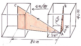 このタンカーは岸の近くを航行しているとして、飛行の様子を岸から透視したらどう見えるでしょうか?秒速4メートルのタンカーは20秒で80メートル移動しますから、タンクの天井の点Bは点Cに移動します。したがって、岸から見ていると模型飛行機は点Aから点Cに直線飛行します。(このときの上昇角は24度、タンク内で観測した63度の半分以下の角度です。)