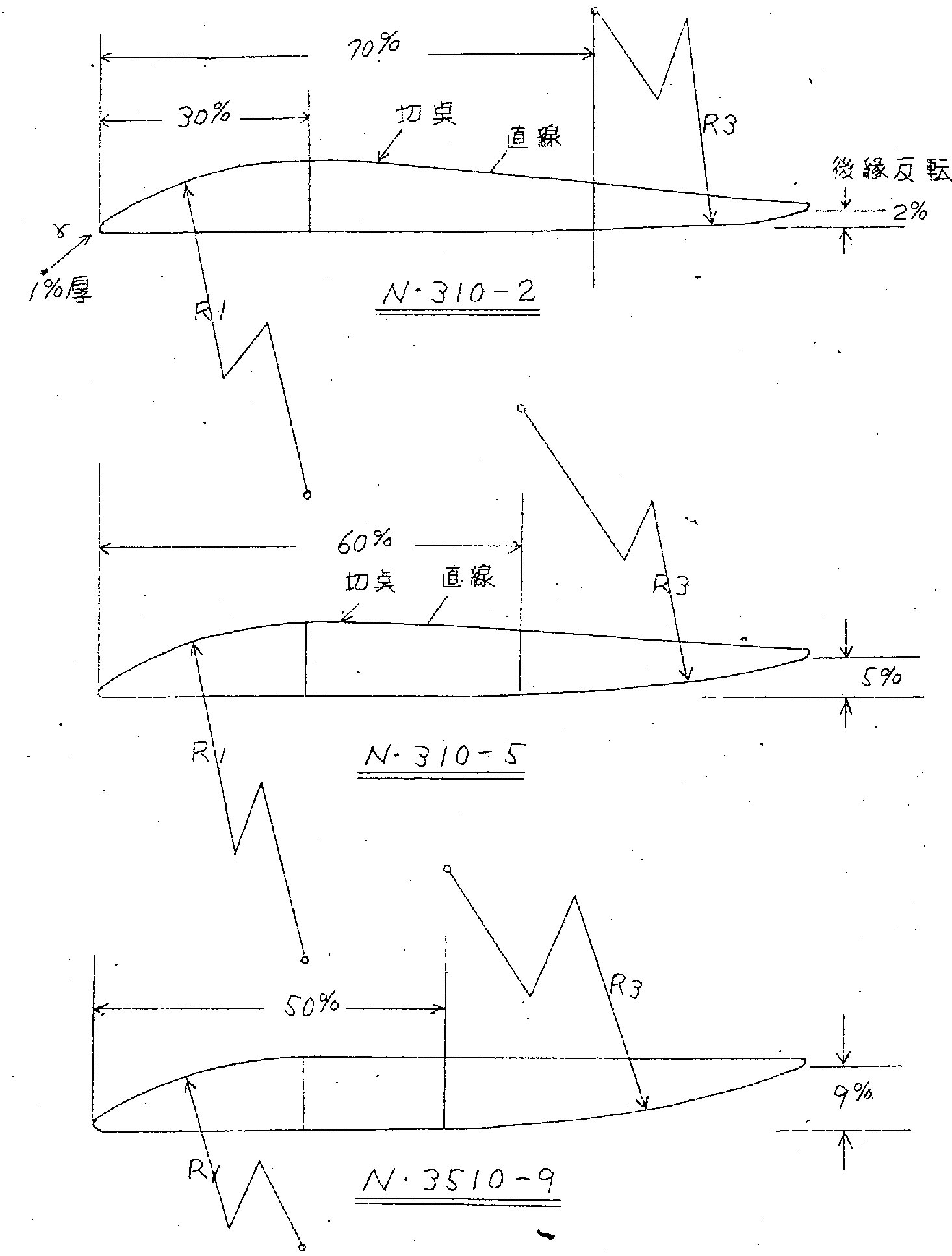(Nシリーズ翼型) 上面、下面共に円弧と直線の組合せで画く。前、後縁の厚みは1%にとり、適度の丸みに画く。