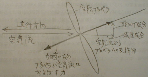 (註)作用の主体をプロペラとするか空気流とするかで説明の順序は多少変わりますが発生する力の関係は同じで結論も同じと確信しています。但し、順序を変えると空気流からプロペラへの作用がプロペラ軸方向に働くことの説明がむずかしそうです。