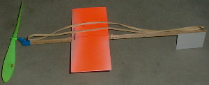 プロペラ直径15cm、ゴム旧Tan3.2mm約2グラムループ、胴体4mmx5mmx30cmバルサ、後部ゴムフック虫ピン、主翼1mm厚スチレンペーパー6cmx14cm、主翼翼台4mmx2mmバルサ、機体重量5.5グラム、ゴム旧Tan3.2mm約2グラムループ、最大巻き数25x25=625