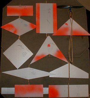 2.写真の翼で左上の3枚と中央の長方形が一番調整が楽でした。前後非対称のものは前後を逆転しても重心さえ再調整すればちゃんと直線上昇します。横長で翼端寄りの翼面積が大きい下の4枚は重心を前進させてもバレルロール(樽の内側にへばりついた様な旋回)が中々とれず、調整に苦労しました。横長は左右の不均衡が発生しやすい様で避けた方がいいでしょう。