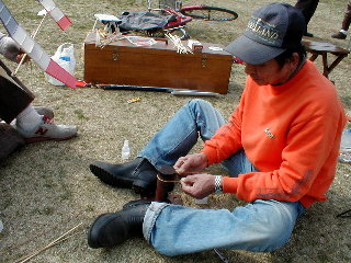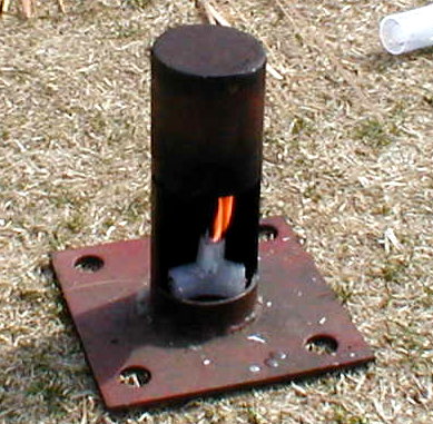 竹ヒゴ曲げ器(08-02-11) 竹ヒゴを曲げる道具です。 厚い鉄板に鉄の円筒を溶接したもの、円筒の側面が空いていて蝋燭を立てる様になっていま。 蝋燭で円筒を加熱してその熱で竹ヒゴを曲げます。竹は水で湿らせて曲げると焦げません。 竹ヒゴ曲げを実演中の所有者松岡恒夫さん、, 2007年3月3日武蔵野中央公園で撮影。