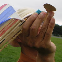 ゴム動力模型飛行機ホームページ 片手投げ(06-05-29) 本籍代々木スカイフレンズの勝山彊さんがこの方法で輪ゴム動力機を投げていたので写りがいいようにA級ライトプレーンでポーズをお願いしました。A級でもちゃんと発進できました。親指、人差し指と中指で機首を持ち薬指でプロペラの回転を抑えます。最大トルク時の手元でのプロペラの空転が無いので何がしかの記録向上に寄与するでしょう。 最初は室内機の小俣昇さんがやっていたそうです。私の「こんなのあり?」 よりスマートです。
