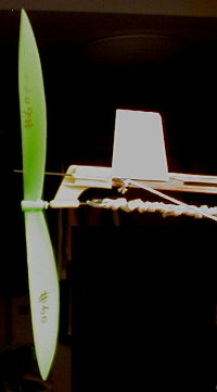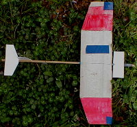 実際にテスト飛行をして高トルク時の上昇が悪いとき、垂直尾翼が過大かどうかを簡単にチェックする方法を紹介します。この方法は被覆胴には適用しずらく、ライトプレーン専用です(HLGはカタパルトグライダーには使える)。方法は非常に簡単で垂直尾翼面積の約1/4程度の薄い垂直「首翼」(バルサやスチレンペーパー)を写真の様に機首に貼り付けます。垂直首翼は垂直尾翼の働きを打ち消す様に働くため(註)、過大のチェックが出来る訳です。このて飛行を試みるのです。これで症状が改善されたら、重心から首翼までの距離(例15cm)と重心から垂直尾翼までの距離(例30cm)の比率を勘案して垂直尾翼を減らせば、丁度よくなります。例の場合は尾翼側のモーメントアームが首翼側のモーメントアームの2倍になるので首翼面積のほぼ半分だけ尾翼面積を減らせばよいことになります。