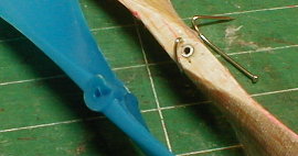 写真の様に虫ピンを先端1cm弱で折り曲げ、プロペラの前面にあけた穴に差し込み瞬間接着剤で固定します。曲げた先の余長は適当に切断すれば完成。折り曲げた先は少しカーブにしてプロペラとのなじみをよくした方が良いようです。