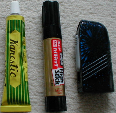 下の写真の左は酢酸ビニール系の接着剤、セメダインC類似の使い勝手ですが、溶剤にアルコールを使っているのでスチレンペーパーが溶ける心配が無く、セメダインCよりも早く数分で固まります。中央は汎用のスティックのり、バルサへのカーボンシートの貼り付けにも使え、重量増が殆どありません。10分ほど水につけておけば剥れるのでやり直しも簡単です。一番右は電池式のライター、火縄の着火の失敗がありません。F. A. I. Model Supplyで扱っています。